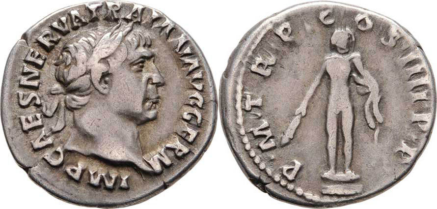 AR Denár, Rv:"P.M.TR.P.COS.IIII.P.P.", Herkules stojící čelně, podobný jako S.886, RIC.49 - mincovna Řím - ražba z let 101 - 102, nep.exc., pěkná patina