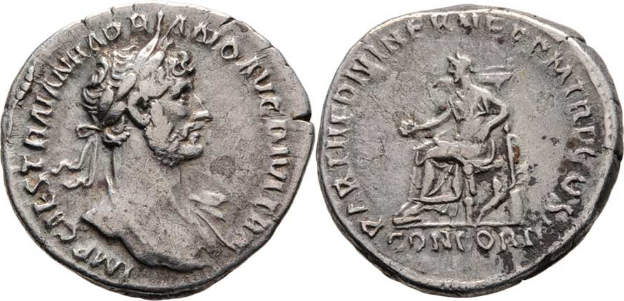 AR Denár, Rv:"PARTH.F.DIVI.NER.NEP.P.M.TR.P.COS. CONCORD.", sedící Concordia, S.neuvádí, RIC.9 - minc. Řím - ražba z roku 117, nepravidelný okraj, patina