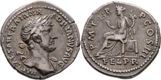 AR Denár, Rv:"P.M.TR.P.COS.III.FEL.PR.", sedící Felicitas, S.neuvádí, RIC.120a - mincovna Řím - ražba z let 119 - 122, nep.exc., pěkná patina