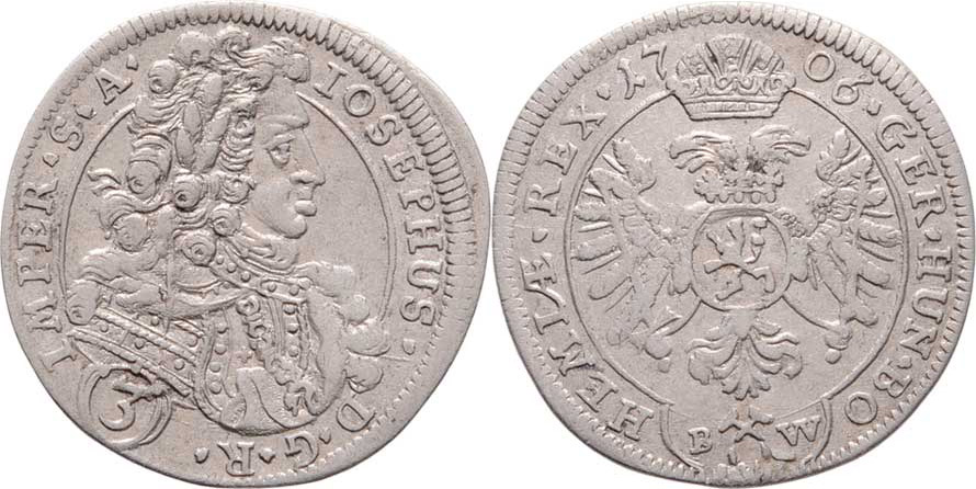 3 Krejcar 1706 BW, K.Hora-Wohnsiedler, MKČ.1731, J.3a, 1.608g, nep.exc., nep.nedor., pěkná patina R!