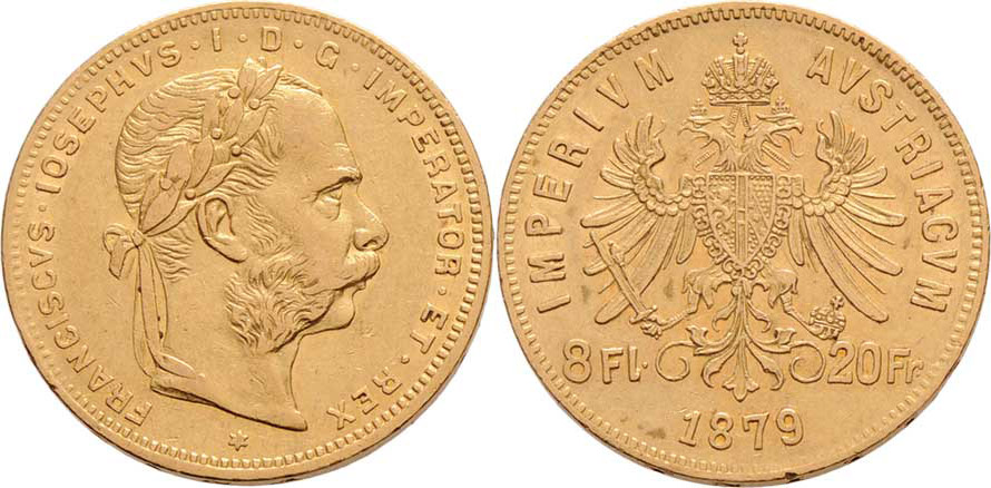 8 Zlatník 1879 (pouze 43.000 ks), 6.430g, dr.hr., nep.rysky, pěkná patina R!