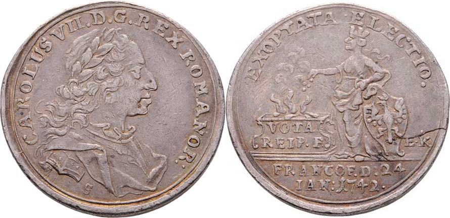 Schild a Kräll - volba císařem ve Frankfurtu 1742 - poprsí zprava, opis/ Germanie u oltáře, opis a nápis, Ag 26mm, 6.369g, Nov.B.28b, dr.hr., dr.rysky, patina