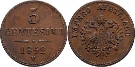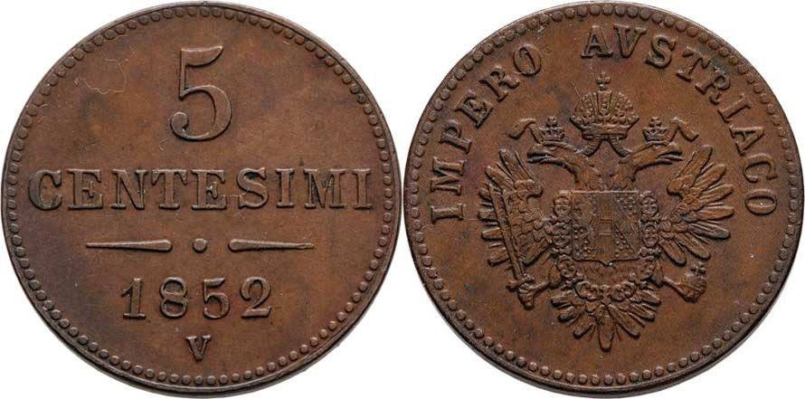 5 Centesimi 1852 V - menší typ, 5.795g, pěkná patina, téměř