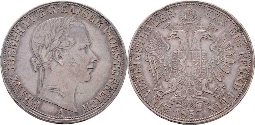 Tolar spolkový 1857 A, 18.465g, hr., dr.rysky, pěkná patina R!