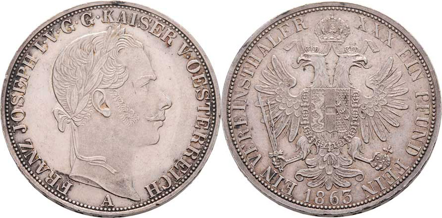 Tolar spolkový 1863 A, 18.524g, nep.hr., nep.rysky, pěkná patina, téměř R!
