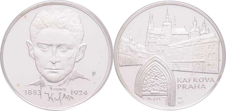 Franz Kafka - 80 let úmrtí 1924/2004 - poprsí čelně, nápis / pražské budovy, nápis, Sign.JB, Punc., Ag925, 40mm, (19.9g), pouze 215ks, kapsle R!