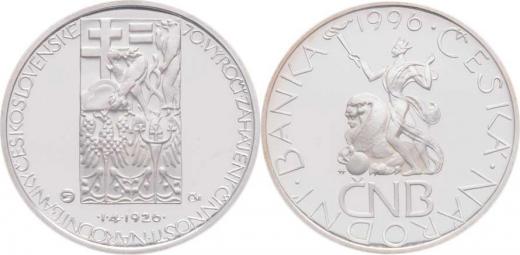 Česká národní banka - 70 let založení 1996 - genius s pochodní, lev, opis / stylizov. znak, opis, Sign., Punc., Ag900, 31mm, 13.122g, kapsle, etue, text