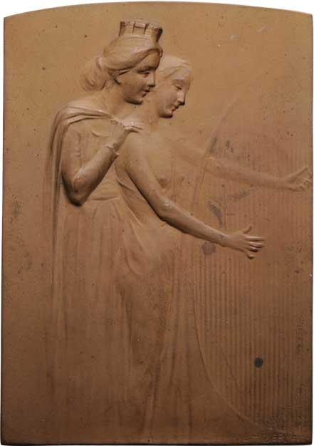 Vindobona a harfenistka - hudební soutěž k 50.výročí Vídeň.filharmonie (1910), Sign., jednostranný patin. bronz 67x100 mm, dr.skvrnka, téměř