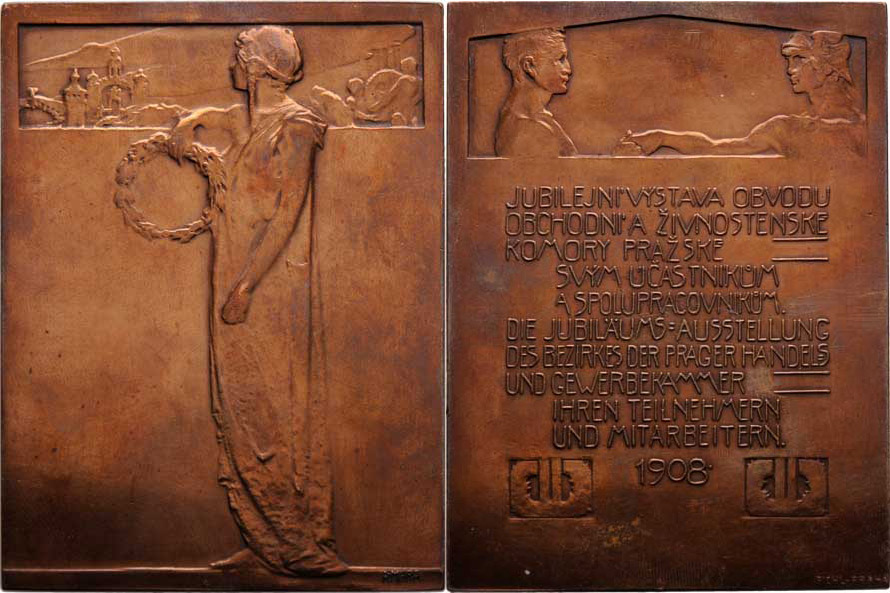Praha - Jubil.výstava obchodní a živnost.komory 1908- stojící postava, pražské výstaviště/ Merkur a dělník, 11-řádk.nápis, Sign., měď 64x89 mm, dr.hr., nep.rysky