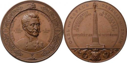 Znojmo - odhalení pomníku plukovníka Kopala 16.X.1853 - poprsí zpředu, dubový věnec, písmo / pomník, znak, písmo, Sign., měď 64 mm, hrany, dr.škr., rys., patina