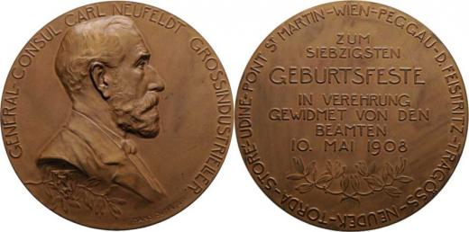 Carl Neufeldt, generál.konsul - 70.narozeniny 1908 - poprsí zprava, německý opis / nápis, vavřín.ratolest a opis, Sign., patinovaný bronz 68 mm, Haus.7693