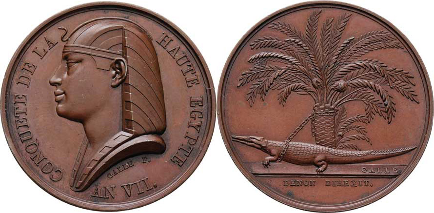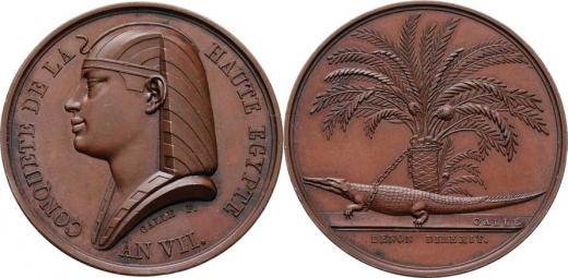 Galle - AE medaile na obsazení Horního Egypta (1799) - Napoleon jako faraon, písmo / krokodýl na řetězu u palmy, Sign., 35mm, 19.905g, Zeitz.9, krásná patina