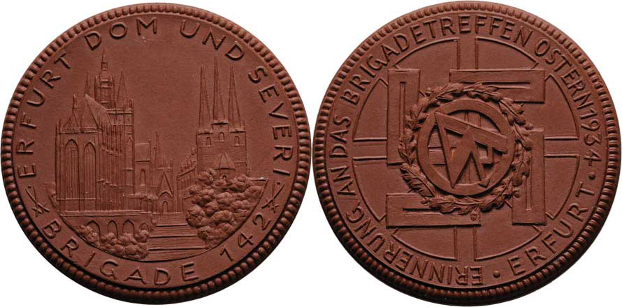 Německo 1934 - sraz 142.brigády v Erfurtu - znak SA, opis / dva chrámy, opis, značený hnědý míšeňský porcelán 51 mm