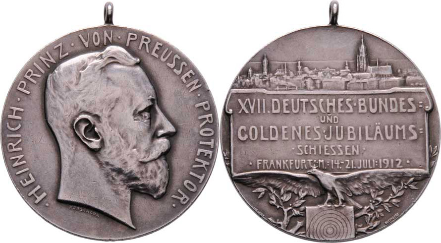 Frankfurt nad Mohanem 1912 - pruský princ Heinrich, opis / pohled na město, nápis, orlice a terč, Sign. Korschan, Ag890, 40mm, 26.199g, pův.ouško, rys., tém.