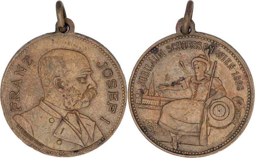 Vídeň 1898 - jubilejní střelby - Fr.Josef I. zprava, opis / žena s terčem a puškou, město, opis, Sign. Pittner, mosaz 29mm s původním ouškem, dr.hr., škr.