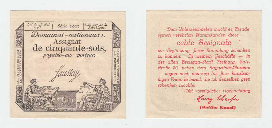 50 Sols 23.5.1793, Pick.A70b, na reversu 13-řádkový přetisk obchodu Antike-Kunst z Freiburgu