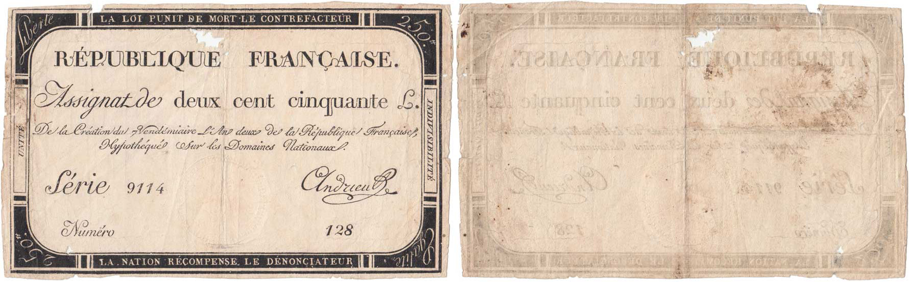 250 Livres, 7.Vendémiaire An.2 (28.9.1793), Pick.A75, protrženo několik menších děr, skvrnky