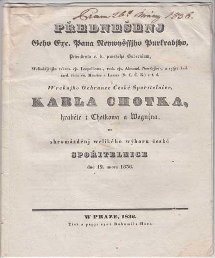 Praha 12.II.1836 - Výroční zpráva České spořitelny (založená 1835) přednesená hrabětem Karlem Chotkem a účetní uzávěrka za rok 1835, velmi dobře