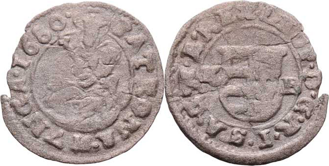 Denár 1680 KB, Nech.1284, Husz.1508, 0.270g, naprasklý, nepravidelný okraj střížku, nedor., patina