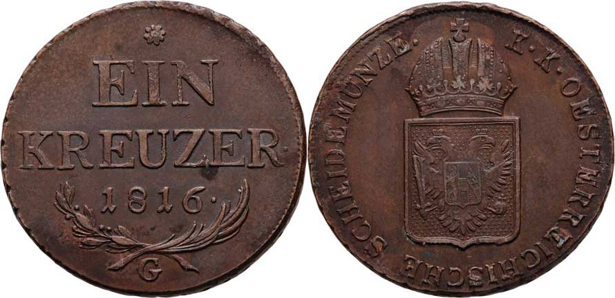 Cu Krejcar 1816 G, Nagybanya, 8.639g, nep.hr., nep.rysky, pěkná patina R!