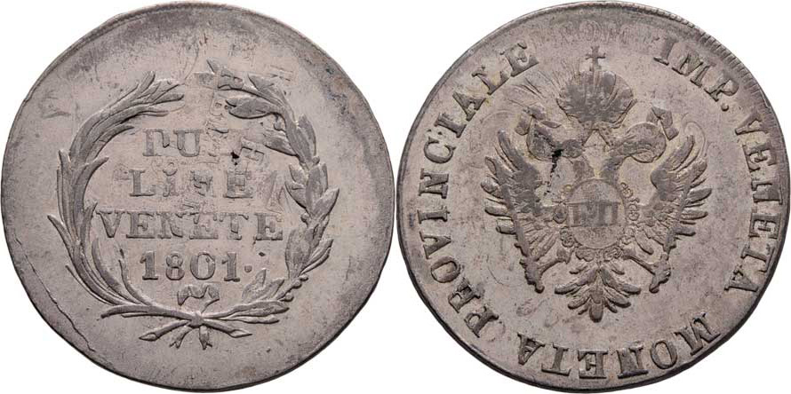 2 Lira 1801 - pro Benátky - dobře patrné stopy přeražby na 24 Krejcaru, P.29, 9.679g, dr.vada střížku, nedor., pěkná patina