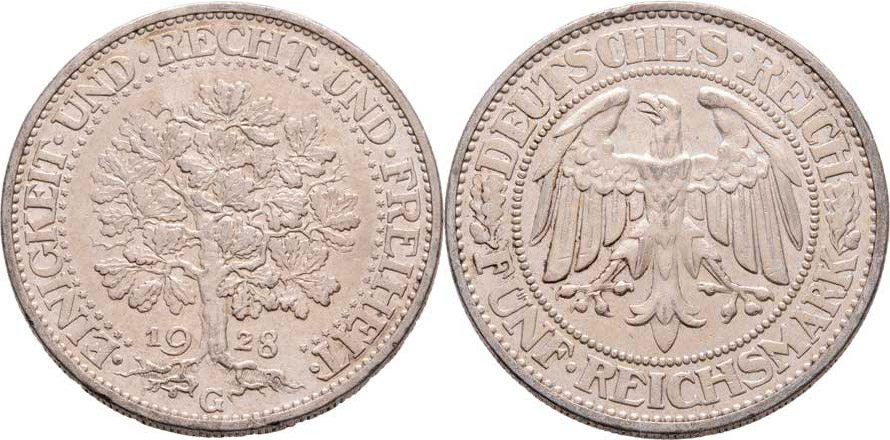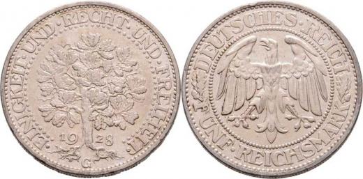 5 Marka 1928 G - dub, KM.56 (Ag500), 25.031g, dr.hr., nep.rysky, pěkná patina