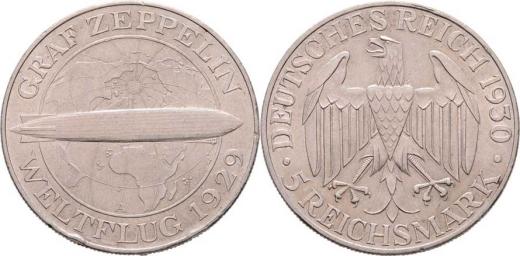 5 Marka 1930 A - Zeppelin, KM.68 (Ag500), 25.012g, hrany, nep.rysky, pěkná patina