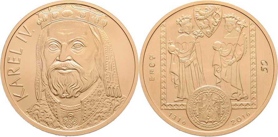 Fojtů - 5 Dukát 2016 - Karel IV.- poprsí zleva, opis/ král a královna, znak, pečeť, Sign., Au986, 34mm, 17.649g, kapsle, etue, certifikát, číslo 50/80 RR!