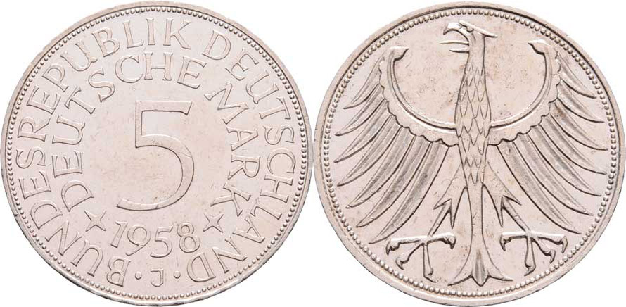 5 Marka 1958 J, KM.112.1 (Ag625), 11.119g, nep.hr., dr.rysky RR!