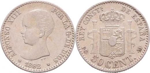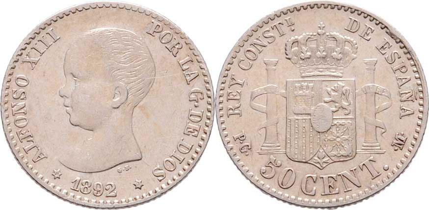 50 Centimos 1892/92 PG-M, Madrid, KM.690 (Ag900), 2.503g, nep.hr., nep.rysky