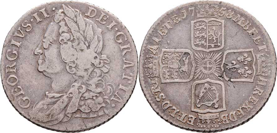 Shilling 1758, Londýn, SCBC.3704, KM.583.3 (Ag925), 5.940g, dr.hr., nep.rysky, kontramarka "H", patina