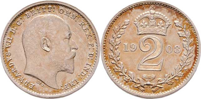 2 Pence 1908 - typ Maundy Sets, Londýn, SCBC.3988, KM.796 (Ag925, pouze 15.000 ks), 0.939g, patina R!