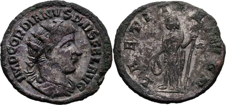 Bilonový antoninianus, Rv:"LAETITIA.AVG.N.", stojící Laetitia, S.2338, RIC.86 - mincov. Řím - ražba z let 241 - 243, tmavá patina