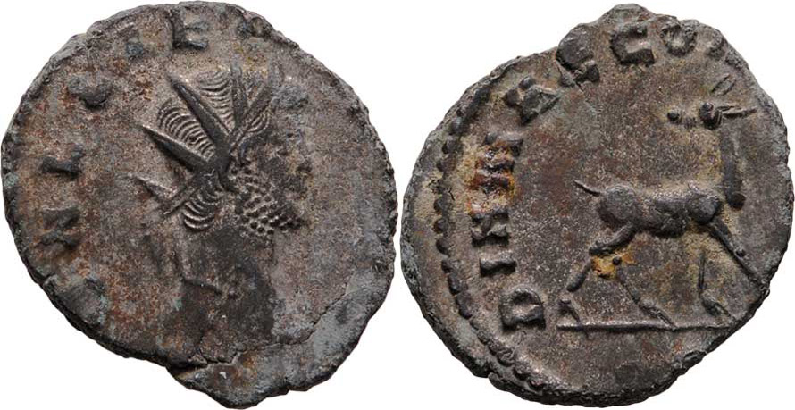 AE Antoninianus, Rv:"DIANAE.CONS.AVG.", laň zprava, podobný jako S.2850, RIC.177 - mincovna Řím - ražba z let 261 - 268, pův.postříbření, exc., nedor., pat.