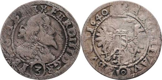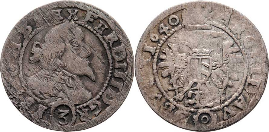 3 Krejcar 1640, zn."O", Olomouc-Schäfer, MKČ.1240, podobný jako ČS.674, 1.715g, dr.vady materiálu, nedor., pěkná patina R!