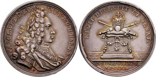 Větší potrét.jeton na korunov. ve Frankfurtu 1711 - poprsí zprava, opis/ klenoty na oltáři, opis a nápis, Ag 26mm, 5.593g, M.1371, Nov.F.45b, nep.rys., patina