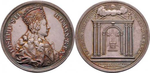 Oexlein - AR medaile na císařskou korunovaci 3.4.1764 - korunované poprsí zprava, opis / chrám se 6 sloupy, písmo, Ag 45mm, 29.209g, Nov.C.5a, H.3126, patina R!