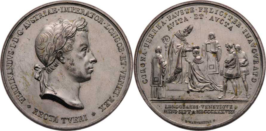 Manfredini - medaile na korunovaci v Miláně 1838 - hlava zprava, opis / korunovace, písmo, Sign., postř. bronz 52mm, Nov.G.1c, M.2578, nep.hr., patina, téměř