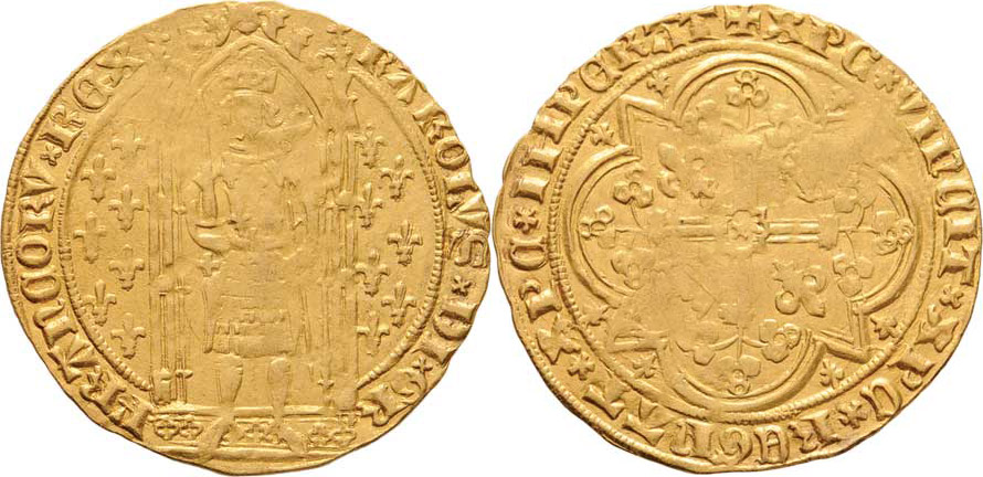 Frank b.l., panovník stojící pod gotickým obloukem, lilie, opis / kříž, dvě lilie a dvě koruny v kružbě, opis, Fr.284, De Wit.I.302, 3.765g, nedor., pat. R!