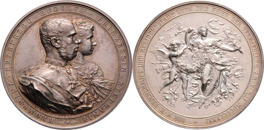 Scharff - AR medaile na památku sňatku 10.5.1881 - dvojportrét zprava, opis / Venuše a Eros nesou erby ve věnci, opis, Sign., 50mm, 54.920g, H.4003, patina