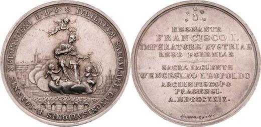 100 let svatořečení Sv.Jana Nepomuckého 1829 - Karlův most, Sv.Jan, andělé, opis / jazyk, 9-řádkový nápis, Sign.LANG, Ag 38mm, 17.516g, Don.4656, dr.hr.,dr.rys.