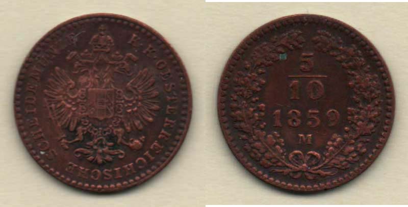5/10 Krejcaru 1859 M, 1.738g, skvrny, patina R!