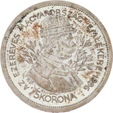 5 Koruna 1896 KB/UP - mileniová - pozdější ražba dle nerealizovaného návrhu, nápis na hraně stejný jako u oběhových uherských pětikorun, 24.133g, patina R!