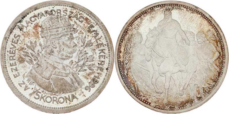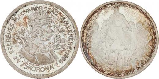 5 Koruna 1896 KB/UP - mileniová - pozdější ražba dle nerealizovaného návrhu, nápis na hraně stejný jako u oběhových uherských pětikorun, 24.133g, patina R!