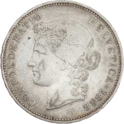 5 Frank 1888 B - hlava Helvetie, KM.34 (pouze 25.000 ks), 24.763g, dr.hr., rysky, patina RR!