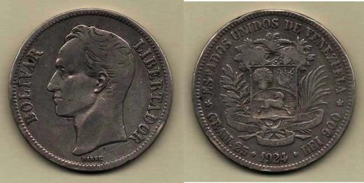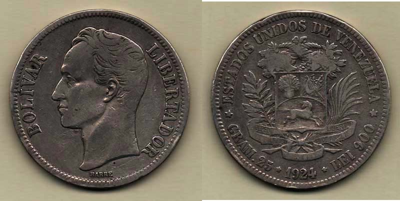 25 Gram (5 Bolivares) 1924, Y.24.2 (Ag900), 24.673g, hr., dr.rysky, patina