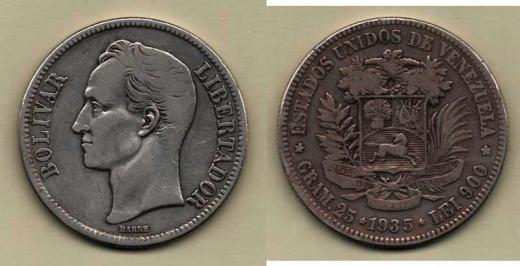 25 Gram (5 Bolivares) 1935, Y.24.2 (Ag900), 24.813g, dr.hr., dr.rysky, patina