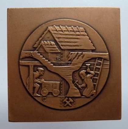 Klečka a Vitanovský - 35 let pobočky 1969/2004 - středověký důl, kladívka / středověký šperk, mince, opis, Nesign., patinov. bronz 50x50 mm, 96.099g R!