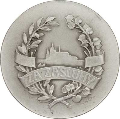 Gremium pražského obchodnictva - za zásluhy - Merkur nesoucí znak Prahy, opis / silueta Pražského hradu ve věnci, nápis na stuze, Sign., Ag750, 45mm, 45.184g