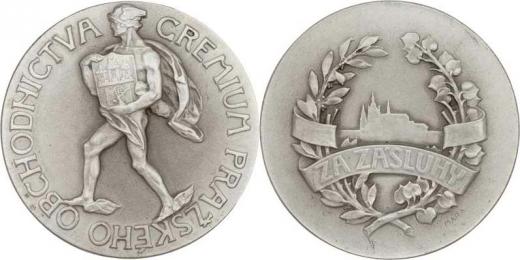 Gremium pražského obchodnictva - za zásluhy - Merkur nesoucí znak Prahy, opis / silueta Pražského hradu ve věnci, nápis na stuze, Sign., Ag750, 45mm, 45.184g